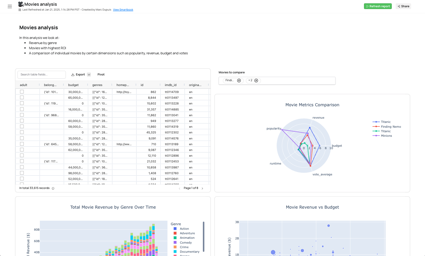With Smartbooks, create shareable analyses that combine Snowflake data, AI explanations, and interactive charts. Automate reporting and push results to Slack, Google Sheets, or slides with Workflows. For deeper exploration, build Python dashboards powered by live Snowflake data.